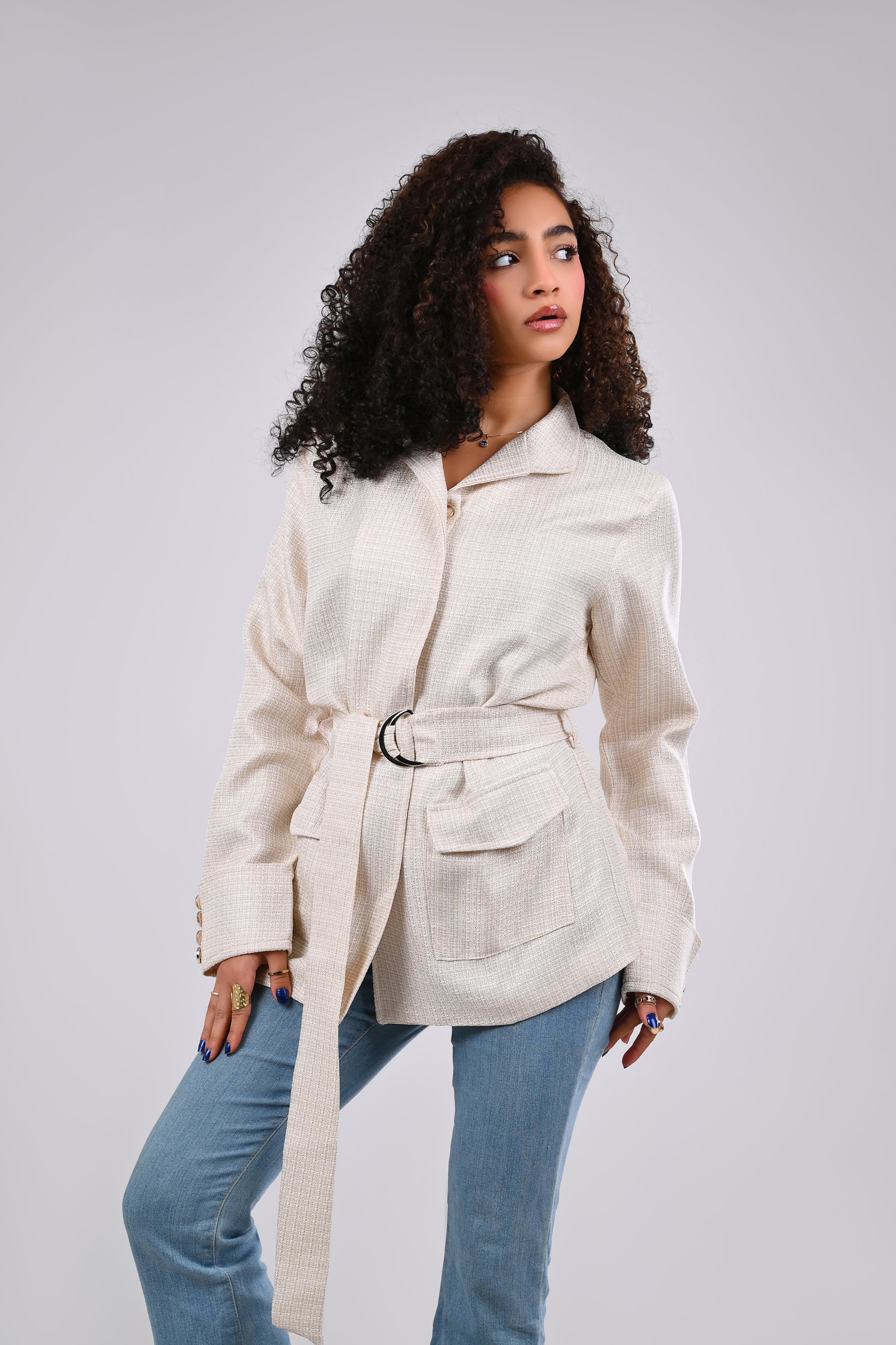 This exquisitely crafted Structured Belted Jacket is the definitive piece for a polished, sophisticated look. It is cut from a premium woven fabric that resembling a finely detailed tweed or bouclé. The intricate surface pattern adds depth and luxury, ensuring it looks far more refined than a standard jacket.