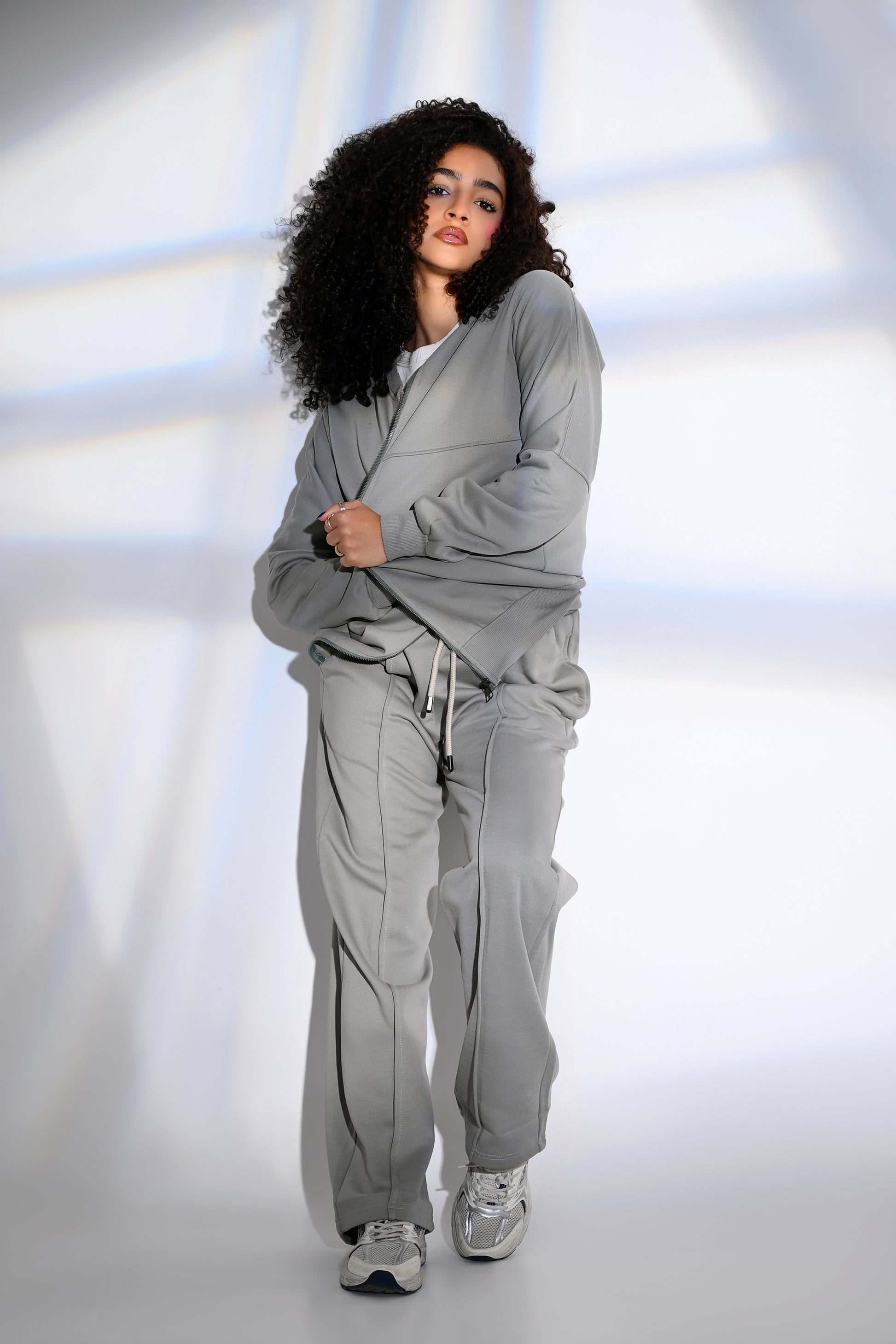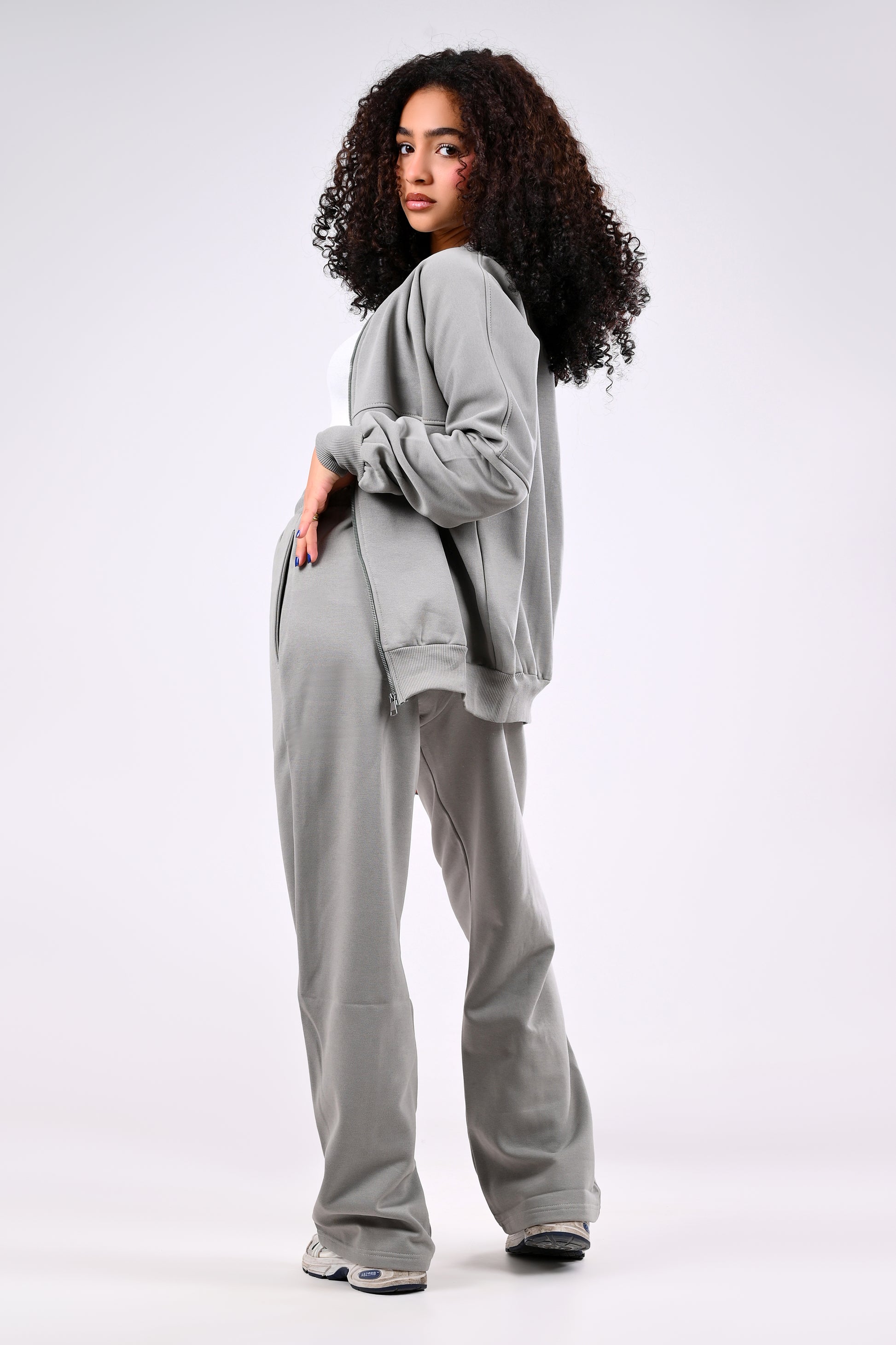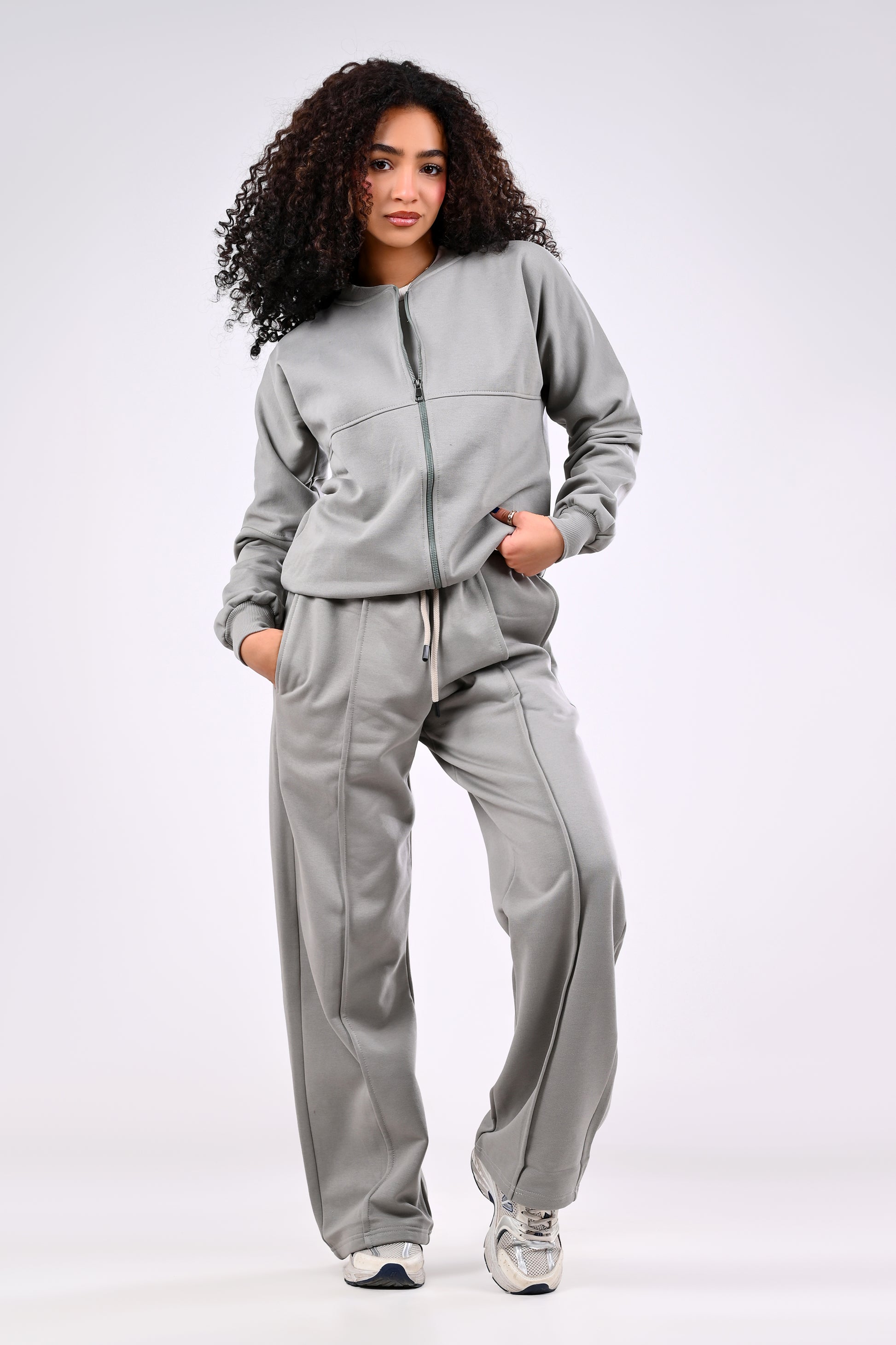 This set includes a long zip-up jacket and matching wide-leg trousers. Both pieces are crafted from soft cotton Melton fabric for ultimate comfort. The trousers feature a stylish wide-leg design and a practical drawstring waistband, while vertical seams on both legs create a sleek, rectangular silhouette. Perfect for travel, casual outings, or a relaxed look.