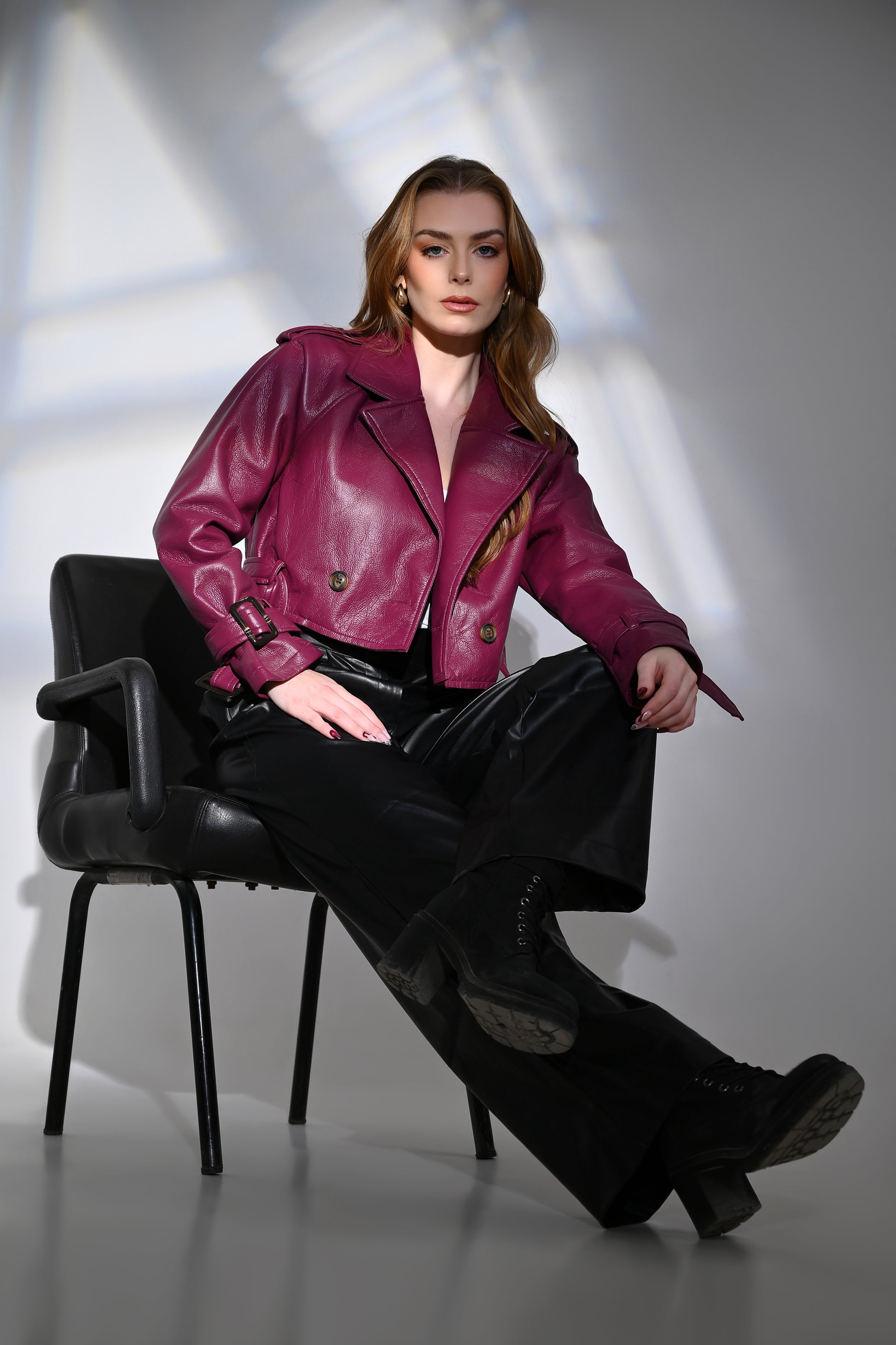 Make an unforgettable entrance in this vibrant Cropped Faux Leather Trench Jacket.