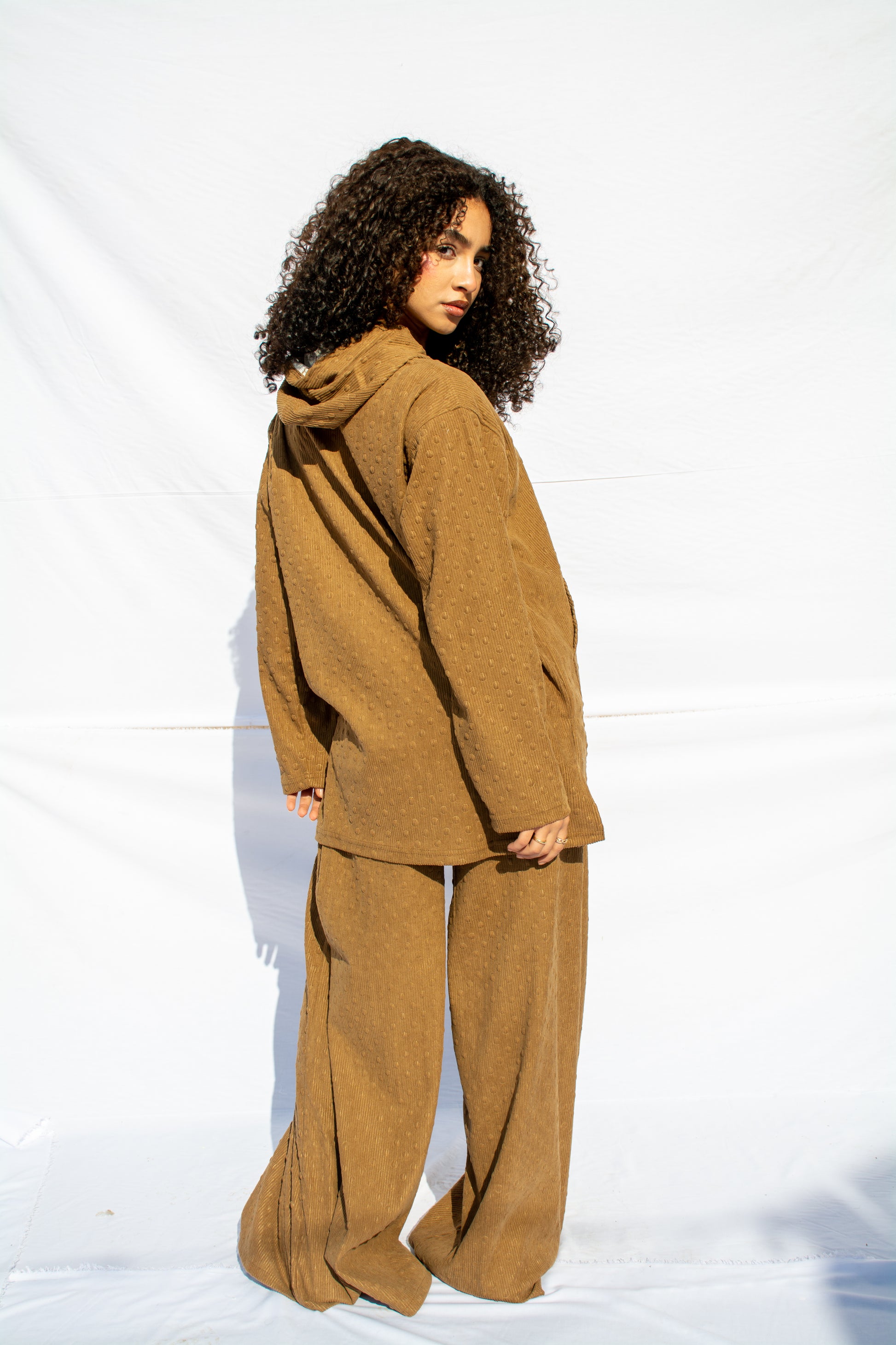 Embrace effortless style and cozy comfort in this richly textured two-piece set. Featuring a relaxed, oversized tunic top with a subtle collar and wide-leg trousers, this set is crafted from a soft, textured fabric—reminiscent of fine-wale corduroy or dotted chenille—in a warm, earthy brown hue. Perfect for a chic, comfortable weekend look or layering as the weather cools. The fluid drape and thoughtful texture add an element of sophistication to this easy-to-wear ensemble.